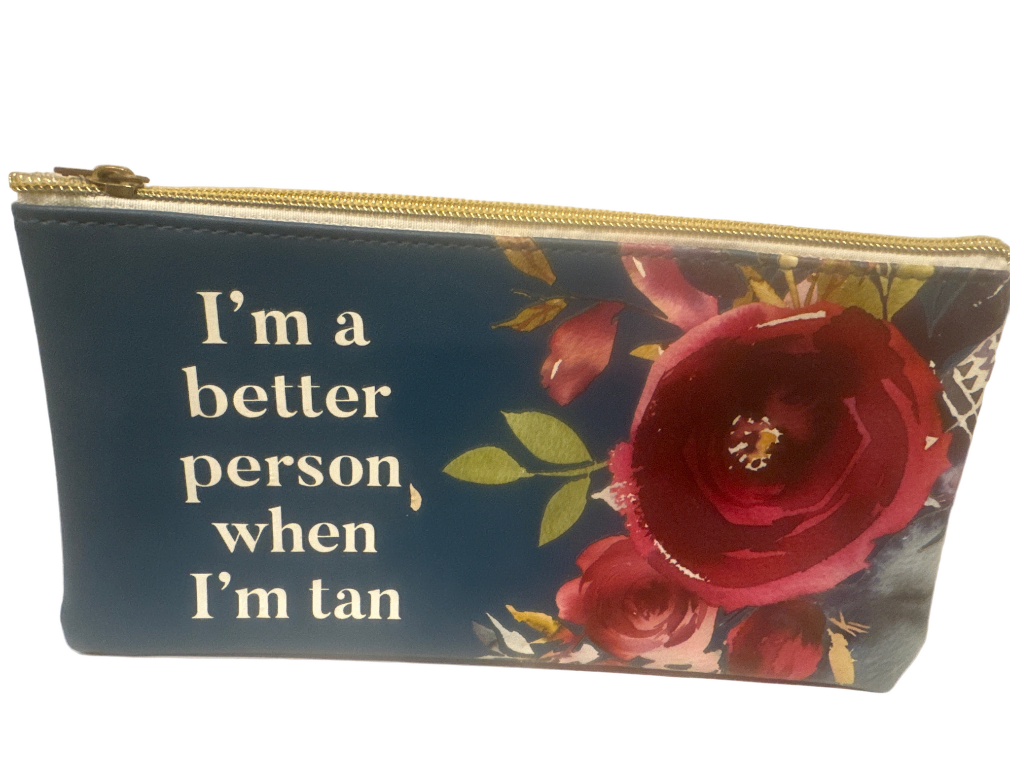 Navy floral background with copy: "I'm a better person when I'm tan